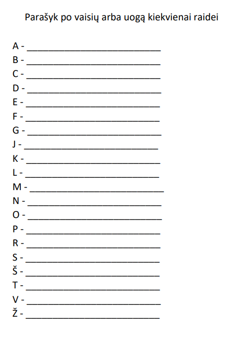 Įrašyk po vaisių ar uogą kiekvienai raidei